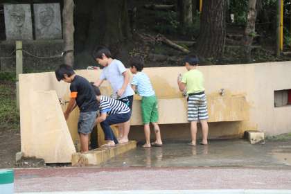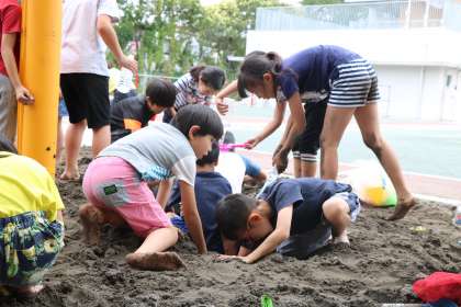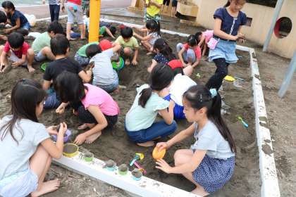 2年生図工「土って楽しいな」の学習のです。新しく完成した造形砂場が、校庭山野の山の横にあります。普段は緑のシートで覆われている図工・生活科用の砂場です。今日は2年生1組・4組がそれぞれ2時間たっぷり土を楽しみました。