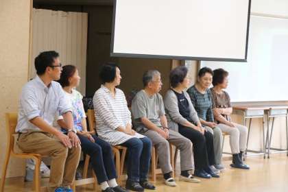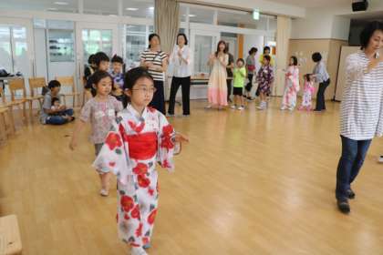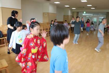 今日は「親子山のてっぺん教室 盆踊り教室」です。悠遊踊ろう会の皆さんを講師にお招きして、砧のお祭りで踊れるように、練習です。みんなで輪になり、輪の中にいる悠遊会の皆さんをお手本に踊ります。