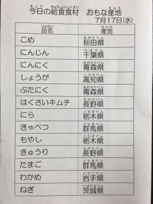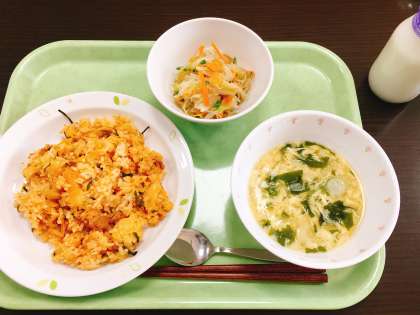 今日は、キムチチャーハン、パリパリ中華サラダ、玉子とわかめのスープ、牛乳です。