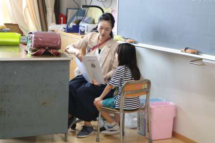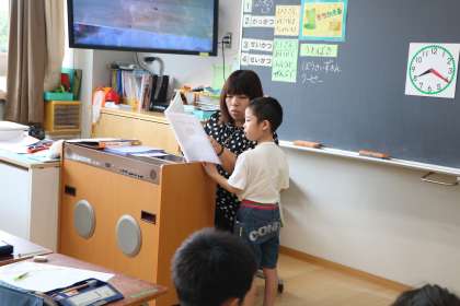 各担任の先生からつうしんせんが手渡されました。子どもたちは、もう、どきどきです。どのクラスも先生が一人ひとり言葉を添えたり、じっくり読む時間を取ったりしながら手渡しています。写真は1年生の様子です。