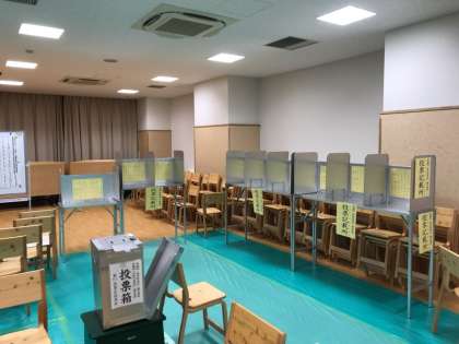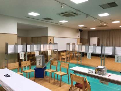 新校舎になって、二度目の選挙です。多目的室が投票所になります。選挙管理委員会の許可をいただいて、様子を撮影させていただきましたので、ご紹介します。