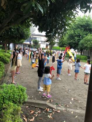 今朝もたくさんの子どもたちがラジオ体操に参加しました。砧中学校ボランティアの皆さんも、ありがとうございます。子どもたちが左からの動きのとき、中学生は右から鏡になって動いてくれるので、それをみながら安心して体操ができます。交通安全の見守りも、ありがとうございます。