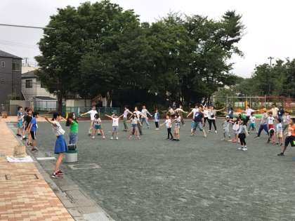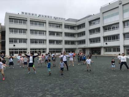 今日は四日目です。雨上がりで水たまりがあるので、いつもとは反対向きで実施しました。出勤前の保護者の方も参加してくださっています。