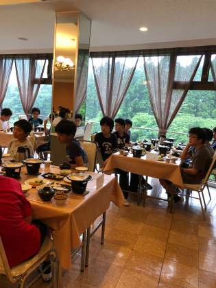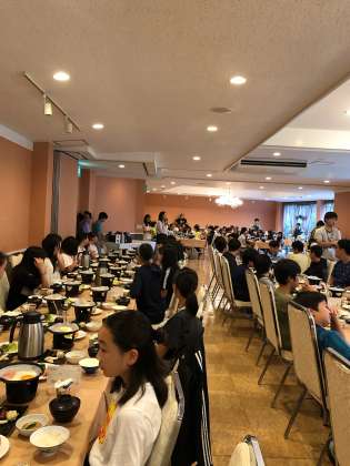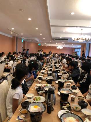 朝食を前にしながらも、朝会の続きです。ホテルの方が配膳をしていらっしゃる中、特別に早めに着席させていただきました。それでも全員静かに話に集中しています。