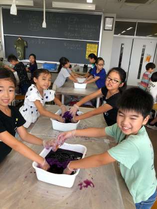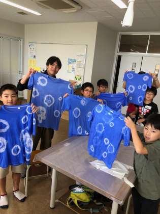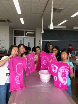 染物教室は、私と、たくさんのお手伝いの皆様と一緒にさせていただきました。ティーシャツを絞り染にします。絞りを解いたときにできている模様に歓声が上がります。