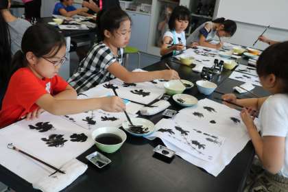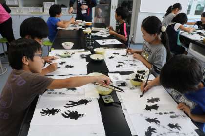 習字の筆で絵を描こう。りっぱな墨絵です。こつをよく聞きお手本を見ながら、筆の向き、墨の付け加減など楽しみながら描きました。