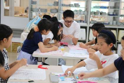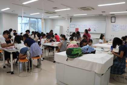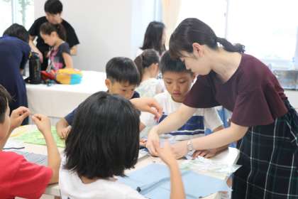 それぞれ30センチ四方の自分の布を持ってきてきんちゃく袋作りです。玉止めや玉結びがまだまだ苦手な子もいますが、みんな頑張りました。お花のような巾着が完成しました。