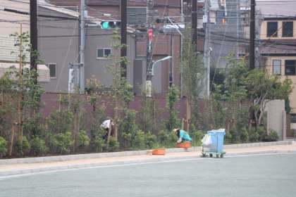この暑さの中、草むしりなどをして学校の植栽をきれいにしてくださっている主事さん方。(写真・上)