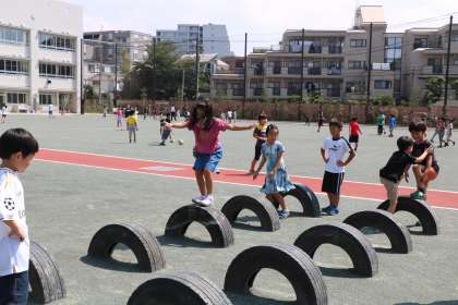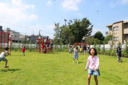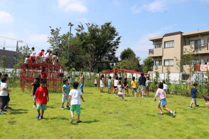 新しい遊具に挑戦する姿もたくさん見られました。芝生に飛んでいるたくさんのトンボを追いかける子も。仲良く元気に遊んでいます。