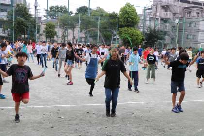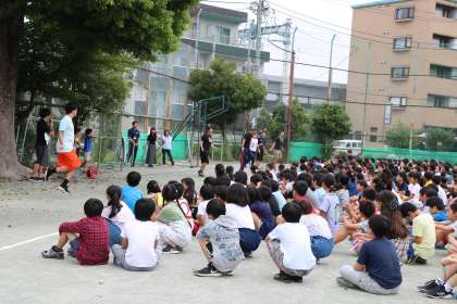 高学年の様子です。高学年の先生方が技の順番を見本で見せた後、子どもたちが挑戦です。身のこなし軽やかに、前跳び、駆け足跳びと音楽に合わせて跳んでいます。