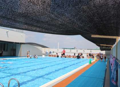 日差しの強いプールサイドには、遮光ネットを張り、テントの下にいるような気分のプールサイドです。夏休みの間に主事さんが作ってくれました。
