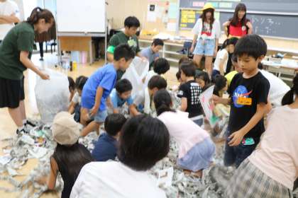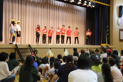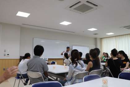 子どもタイムは、大学生じゃり研のお兄さんお姉さんが考えてくれた防災にちなんだゲームを、グループごとに楽しみます。大人は、会議室で、防災の話を聞いたり、3年生のゲストティーチャーとしても来ていただいている地元で生まれ育って70年以上の方に昔の山野の地域の話を聞いたり、コーヒータイムを楽しみます。