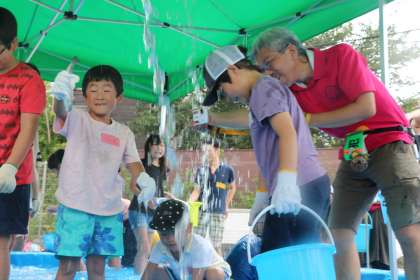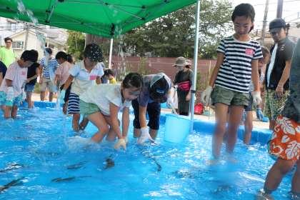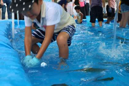 いよいよ特設プールの中に入ります。ニジマス、アユを追いかけて、追いかけて。ぬれたって大丈夫!