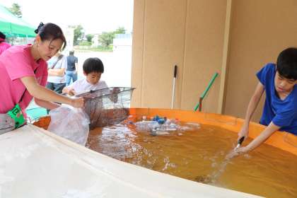 おやじネットの食育体験イベント、つかみどり「やまの」が久しぶりに復活しました。特設プールに離された魚を追いかけ、自分の手でつかまえ、さばいて、焼いて食べることで「(命を)いただきます」の言葉の意味を考えます。