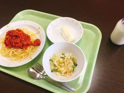 今日は、スパゲティミートソース、イタリアンサラダ、りんご、牛乳です。
