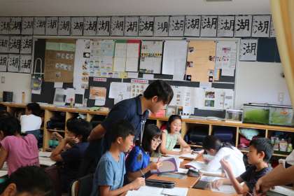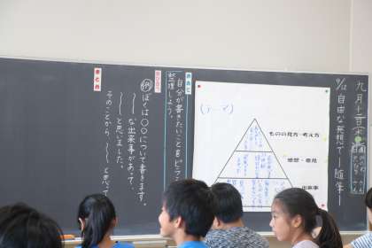 6年生は国語で、随筆を書く学習に取り組んでいます。心を動かされた出来事、人に伝えたくなる体験を書きとめておきます。今日は、テーマを選び、構想を考えます。先生にアドバイスをもらったり、図に表したりしながら書きたいことをまとめます。