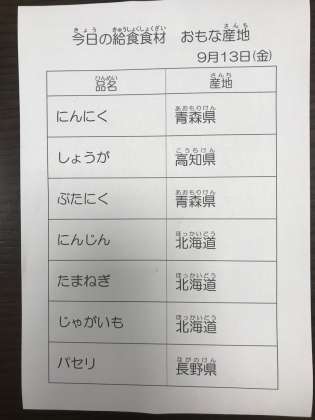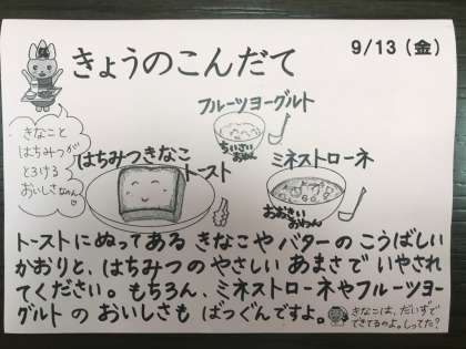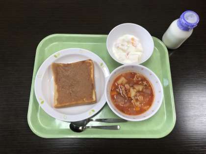 今日はパン食です。はちみつきなこトーストの甘さが、フルーツヨーグルトの酸っぱさを引き立てます。3年生の午前中の授業の関連で言えば、きなこの原料は大豆ですね。みんなちゃんと理解しているかな?