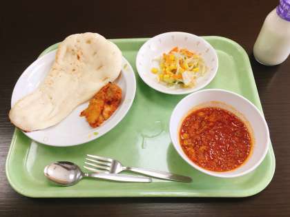 今日は、ナン、キーマカレー、タンドリーチキン、コーンサラダ、牛乳です。