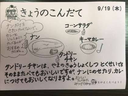 何と、ナンとキーマカレーの黄金の組み合わせに、タンドリーチキンとサラダまで付いています。給食室特製のタンドリーチキン、きっと段取りーをキチンとしていたのだと思います。