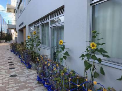 台風にも負けず、第1昇降口右横のひまわりが咲いています。強風を乗り越えたのだから、本当にすごいです。余談ですが、今年の夏、山梨県のひまわり畑を見ました。教科日本語の山村暮鳥の詩ではありませんが、それこそ、いちめんのひまわりでした。機会があれば、ぜひご覧ください。