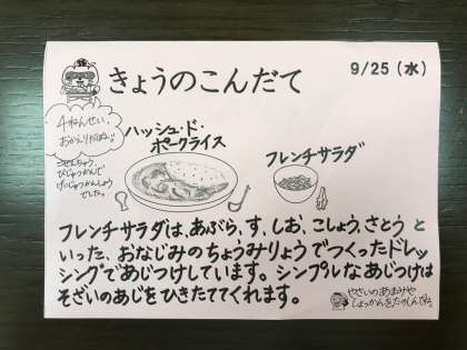 今日はハッシュドポークライスとフレンチサラダ、洋食の王道をゆく献立です。子どもの頃、ハヤシライスは、カレーライスに比べて高級なイメージがありました。実際、我が家の食卓に登場することは滅多にありませんでした。その影響からなのか、今でもおいしいハヤシライスのお店を探しております。フレンチサラダのドレッシングは、お酢と油、塩などで作られています。シンプルな味付けがうれしいですね。