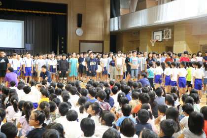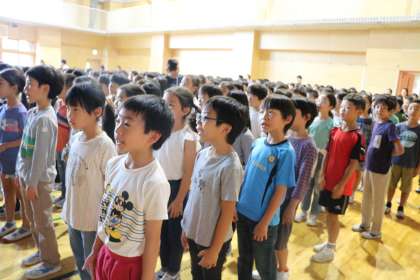 今日の音楽集会の歌は「宝もの」です。1年生は初めて聞く曲なので、2年生以上の歌を聞かせてもらいました。素晴らしい発声、ハーモニーで、歌い終わった後1年生から拍手が起こりました。