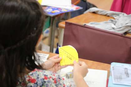 直線で囲まれた線なので、角が丸くなっているテレビや配ぜん台は、直角ではないので、長方形とは言えません。子どもたちは厳しく三角定規や折り紙で作った「直角」の角を当てて、確認しています。