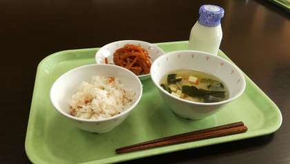 今日の献立は、梅おこわ、小鰯(いわし)と鶏肉の南蛮漬け、豆腐のすまし汁、牛乳です。