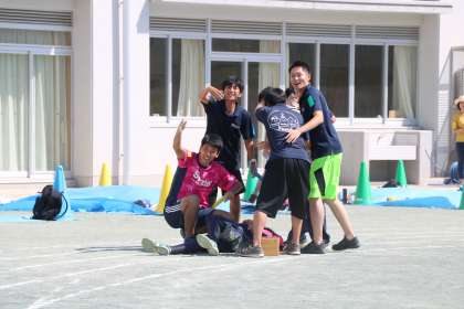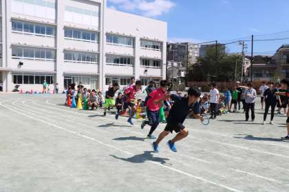 全員リレーの第一走者は先生方です。元気良くスタートしたのですが、バトンを渡す寸前で一人転んでしまいました。すると全員で駆け寄り、救急隊を要請しました。手当てをした後、マスク姿の人も紛れ込み?全員でゴールしてバトンを渡しました。実は、計画通りの小コント。みなさん楽しんでいただけたでしょうか。