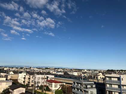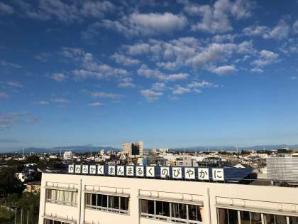 寒冷前線が通過後、乾いた空気に入れ替わり、強い北風にさらされた木々がザワザワと音を立てている朝です。写真は秋晴れの屋上からの様子です。やわらかく…の上あたりにまだ雪のかぶっていない富士山がご覧になれるでしょうか。