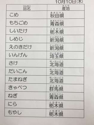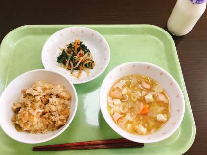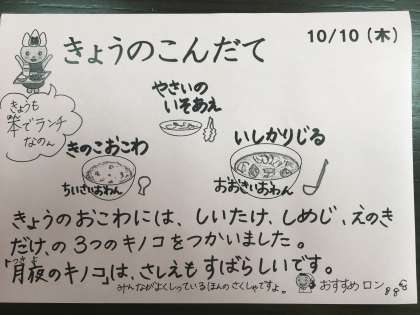 今日は、きのこおこわ、石狩汁、やさいのいそああえ、牛乳です。