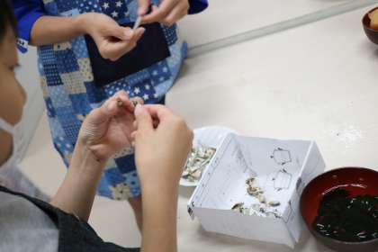 5年生家庭科、みそ汁の調理実習の様子です。頭とはらわたを丁寧にとった煮干しで、だしを取ります。野菜は大根と長ネギ、わかめも入ります。乾燥わかめがこんなに増えた!とびっくりする子どもたち。担任の先生も心配そうに、様子を見に来てくれました。