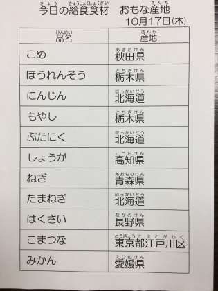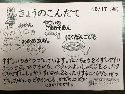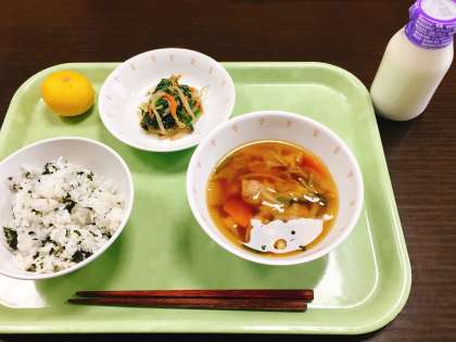 今日は、わかめごはん、肉団子汁、野菜のごまみそあえ、みかん、牛乳です。