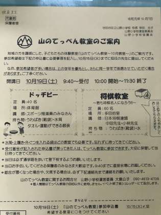 今日は、山のてっぺん教室が開催されます。申し込みをされた方は、雨が強く降る時間もあるようです。気を付けて学校に来てください。都合が悪くなった場合や欠席する場合は、ご案内の紙にある運営委員の携帯までご連絡ください。