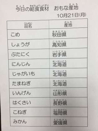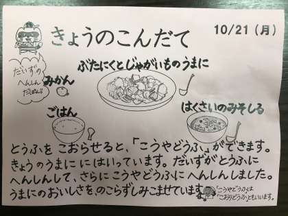 「豚肉とじゃがいものうま煮」は、高野豆腐とコンニャクが入っています。「肉じゃが」というと、肉、じゃがいも、にんじん、玉ねぎ、しらたきが入ったものを想像しますので、今日の献立は「うま煮」と呼んだ方が適切なのかもしれませんね。校舎建て替え中で仮校舎のとき、センター給食だったのですが、献立に「肉じゃがのうま煮」という不思議なネーミングの献立がありました。
