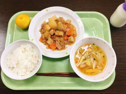 今日は、豚肉とじゃがいものうま煮、白菜のみそ汁、みかん、牛乳です。