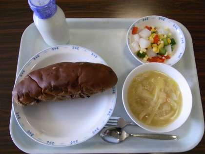 今日の給食は、チョコチップパン、牛乳、トロピカルサラダ、ヌードルスープです。給食献立メモから…「トロピカルサラダには5種類の食品が入っていますが、何が入っているかわかりますか?正解は、きゅうり、大根、とうもろこし、赤ピーマン、チーズです。赤、白、黄色、緑と色鮮やかなところからトロピカルサラダという名前がつきました。給食ではいろいろな食品が出るので、今日は何が入っているかなと、興味をもって毎日見てくれるとうれしいです。」