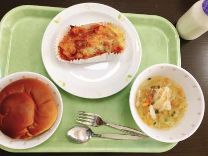 今日は、うずまきパン、ラザニア、ジュリアンスープ、牛乳です。まるで街角のイタリアンレストランのランチのようなメニューです。給食のラザニアは、今年の6月21日と昨年の6月1日にありましたが、両日とも金曜日だったので、私は初食です。これは、イタリアンレストランの味ですね。献立表に、「うずまきパン」と書いてあるのを、最初、「うますぎパン」と読んでしまい、どんなパンなのか期待してしまいましたが、普通のパンでした。