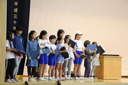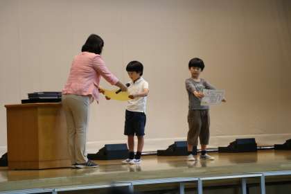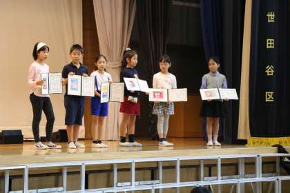 朝会の後半は表彰です。今日は世田谷区の絵画展とよい歯のコンクールで受賞した児童の表彰を行いました。