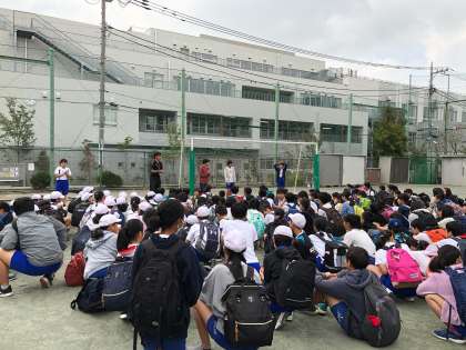 連合運動会のため、駒沢陸上部競技場へ出発します。第二グラウンドで応援の練習もしました。