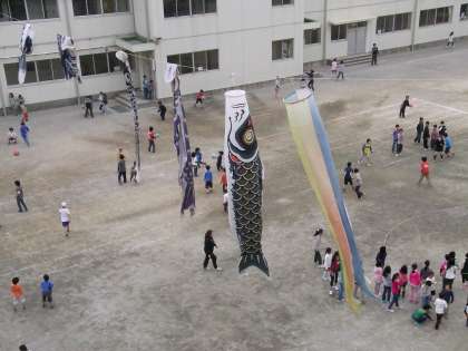 今日から校庭にこいのぼりが上がりました。昔は、山野の山のてっぺんにこいのぼりをあげた時代もあったらしいです。都会だとなかなか大きなこいのぼりは上げられないので、一番大きなまごいが悠々と泳いでいる様を見ると、雄大だなあと思います。子どもたちも、このように育っていってほしいなと思いました。