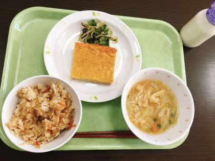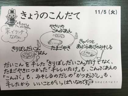 今日は、切干大根ごはん、玉子焼き、野菜の昆布あえ、きゃべつと油揚げのみそ汁、牛乳です。