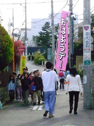 今日のおはようデーは、門の所ではなく街に出て行ってみました。子どもたちは元気にあいさつをしてくれます。路地に「おはようございます」の声が響きます。保護者の方々も、子どもと一緒に歩き、あいさつを交わしてくださいます。毎月0のつく日のおはようデーを積み重ねていけば、あいさつのあふれる街になると強く思いました。ありがとうございます。そして、今後もご協力お願いします。