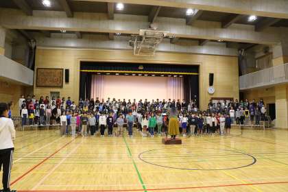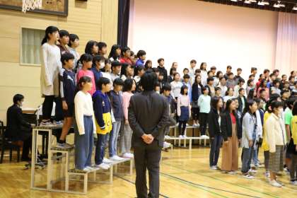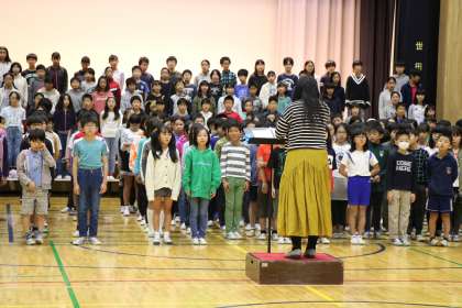 エンディングの歌練習の様子です。先日の音楽集会で歌った元気いっぱいのオープニング曲「なかまをしんじて」とはまた、ガラッとイメージの違う、しっとりとした、ハーモニーの美しい曲「宝もの」です。山野小高学年の力は素晴らしいです。