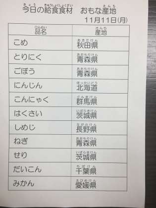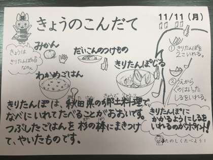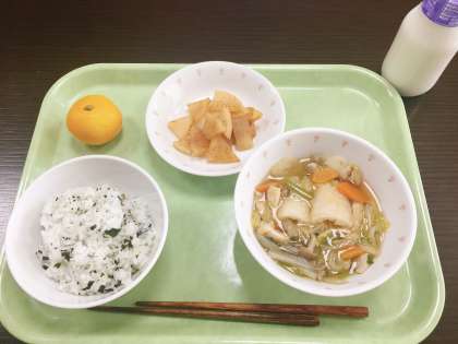 今日は、わかめごはん、きりたんぽ汁、大根の漬物、みかん、牛乳です。
