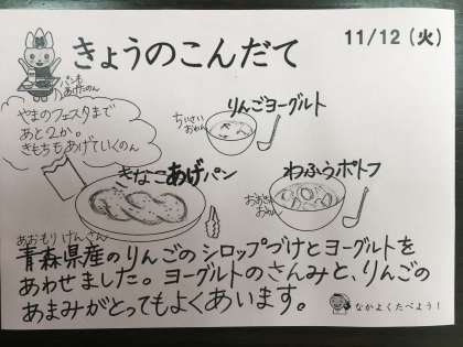 今日は、きなこ揚げパン、和風ポトフ、りんごヨーグルト、牛乳です。