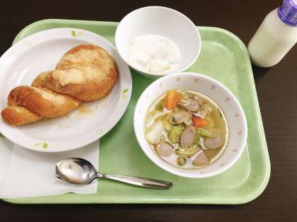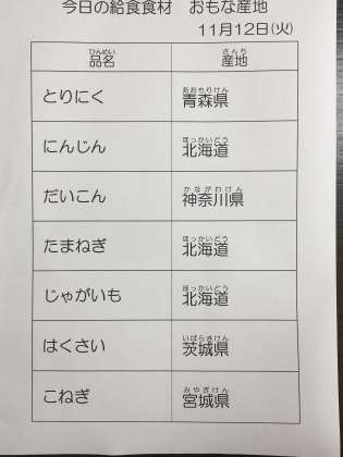 献立イラストの中で、やまのんが「パンもあげたのん」と、言っています。誰にあげたのかと思ったら、給食室で揚げたということなのですね。給食で定番のきなこ揚げパン、私はシナモンが好きなのですが、きなこも美味しいです。和風ポトフは、洋風のコンソメと一味違う上品な味です。鶏肉やウィンナーが入っているので、だしの味がよく分からないのですが、昆布だしだったのかな?
