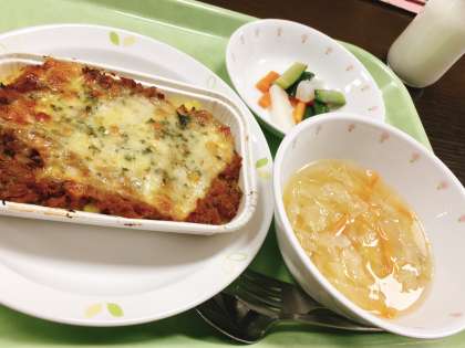 今日は、カレードリア、三色野菜のピクルス、野菜スープ、牛乳です。