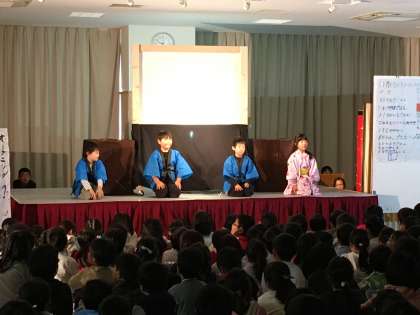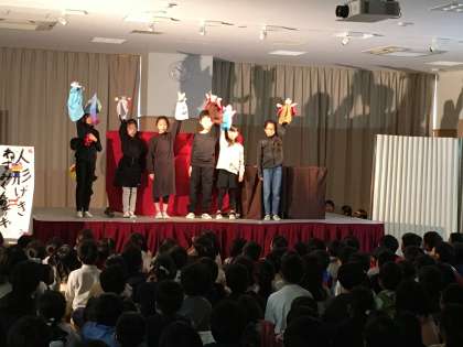 3年生の「やまのシアター〜衝撃を受ける小劇団〜」なぞかけ、影絵、人形劇、落語など、とても衝撃的な内容です。