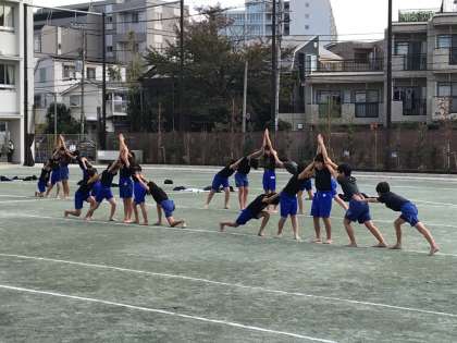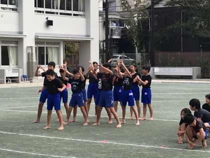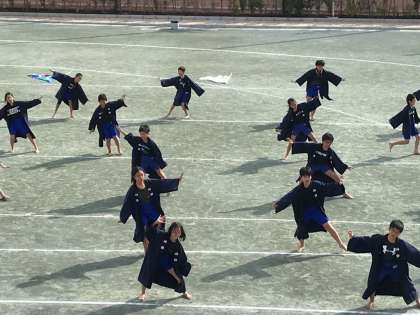 リトルマーメイドという題は海つながりでした。ニュージーランドのラグビーでおなじみのハカに続いて、映画「海猿」の勇壮な音楽をバックに組体操。その後ははっぴ姿の南中ソーランです。